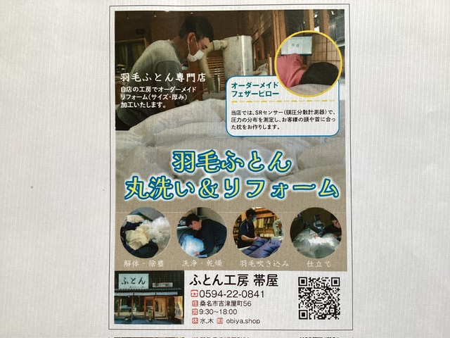 三重県桑名市 羽毛ふとん専門店 ふとん工房帯屋です。自店の工房でオーダーメイドリフォーム(サイズ・厚み)加工いたします。